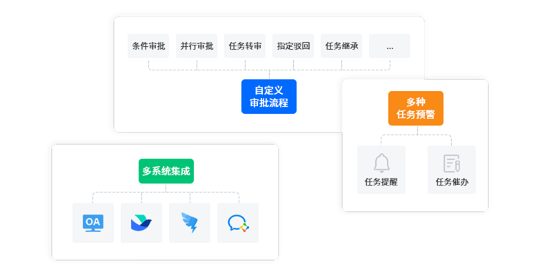 高度灵活自定义审批流程,条件审批、并行审批、任务转审、指定驳 回、人员离职后任务继承等等