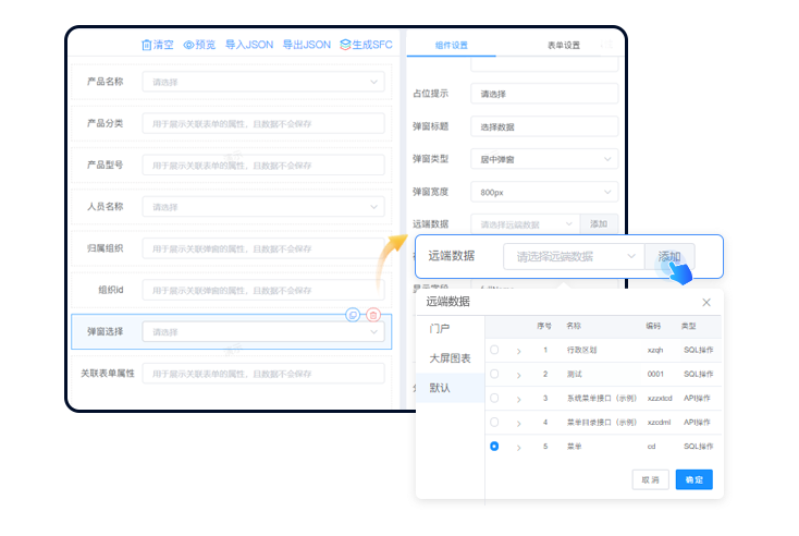 允许用户定义数据结构,包括实体、属性、关系等,支持数据库表、API接 口等多种数据源