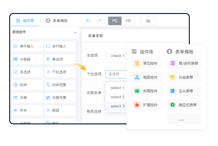 提供丰富的预构建组件库,如表单、表格、按钮、图表等,用户可以通过拖 拽方式快速搭建应用界面,无需编写大量代码。